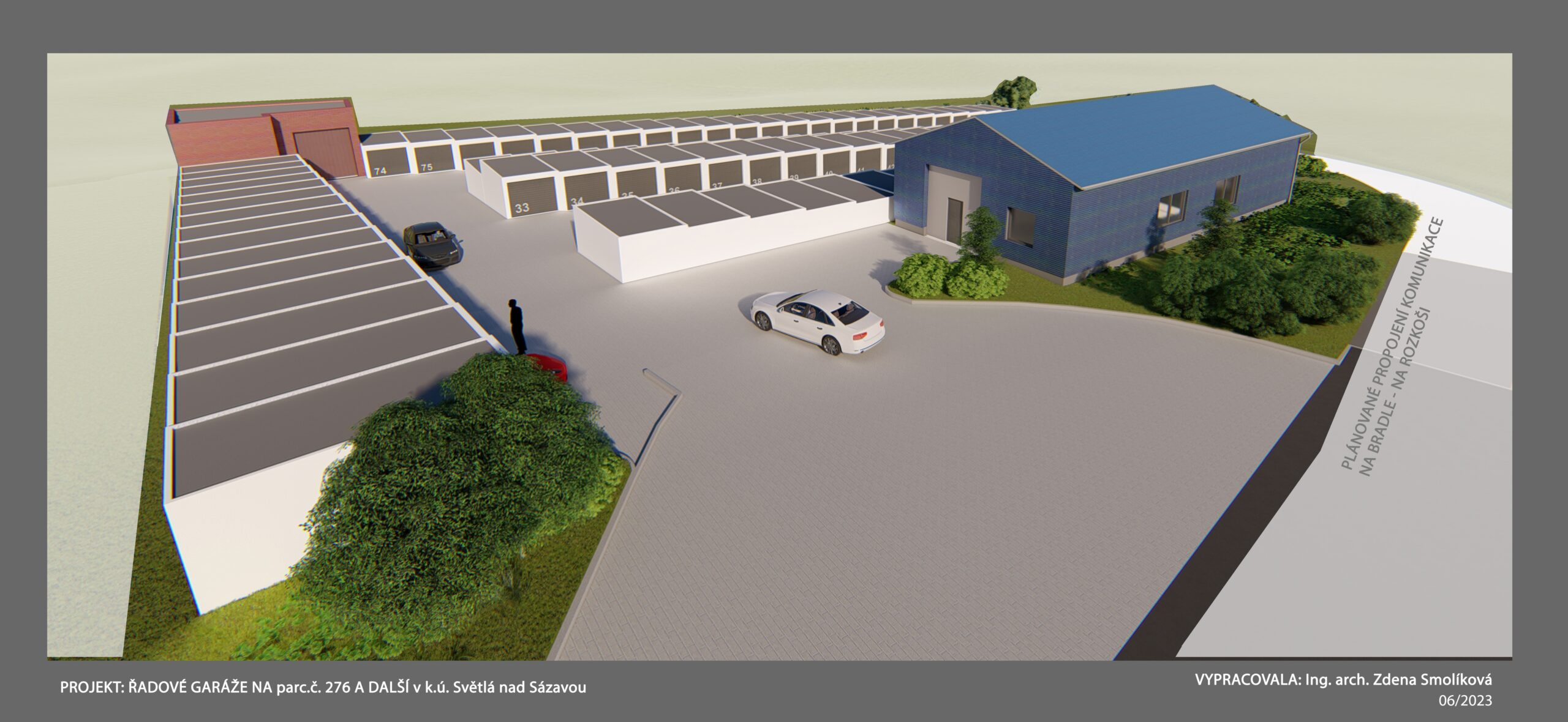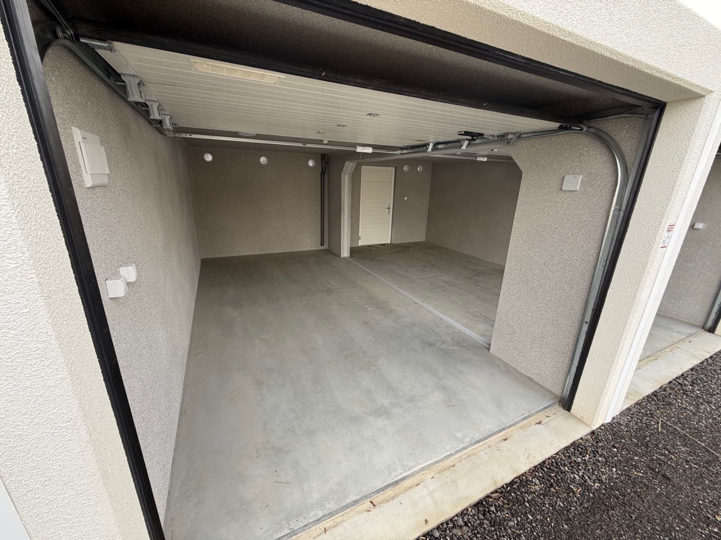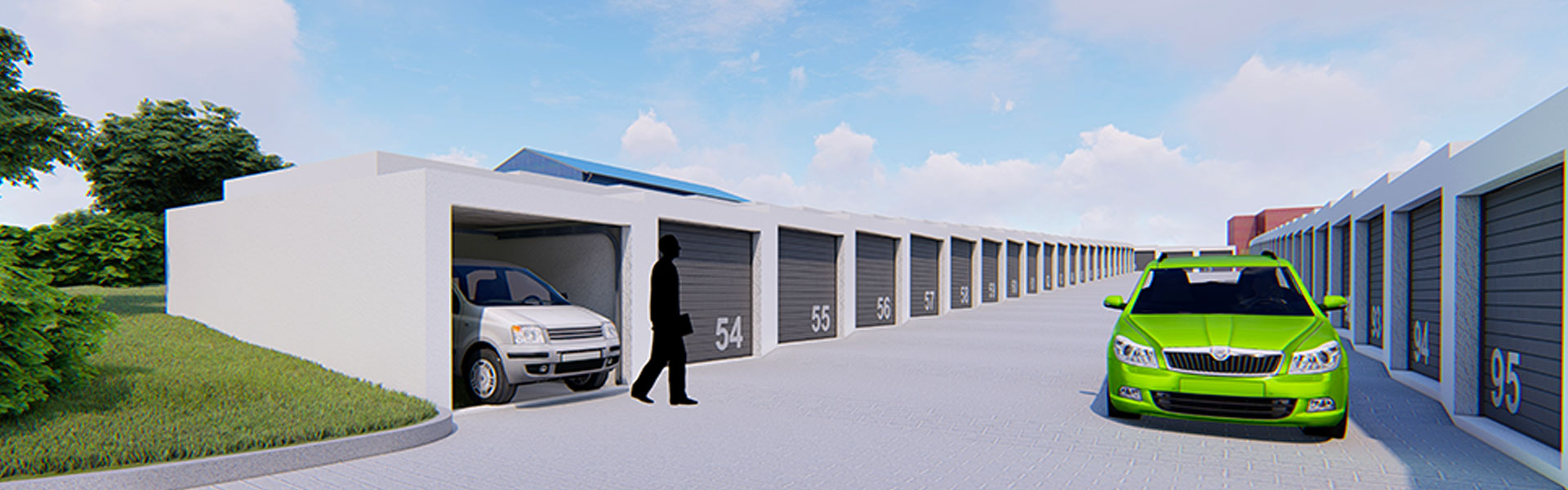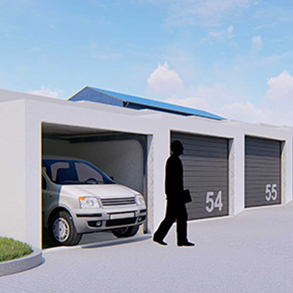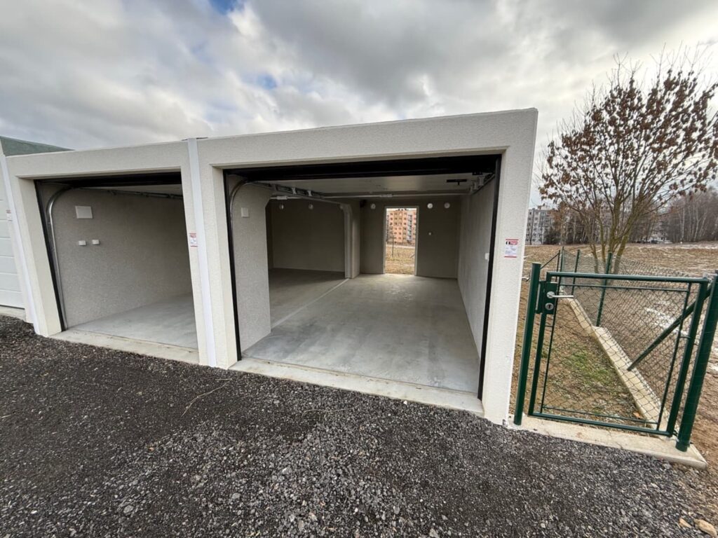 Veškeré garáže jsou vybaveny vždy výsuvnými sekčními vraty, rozvodem elektrické energie se samostatným podružným měřením.
